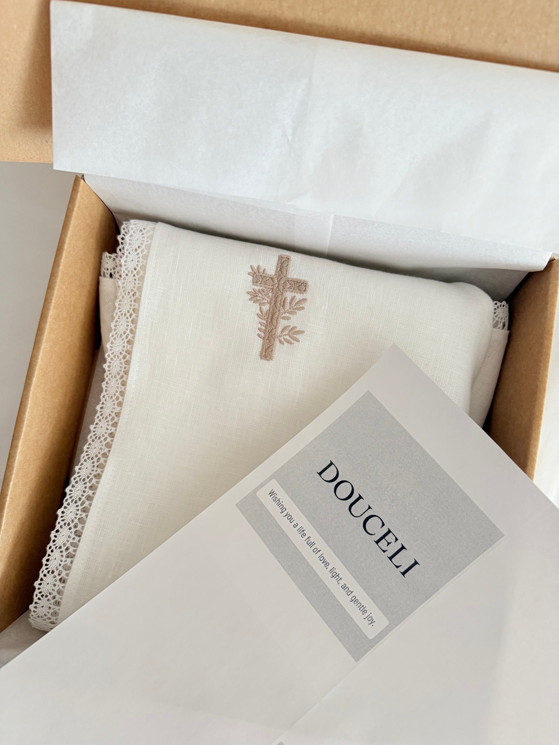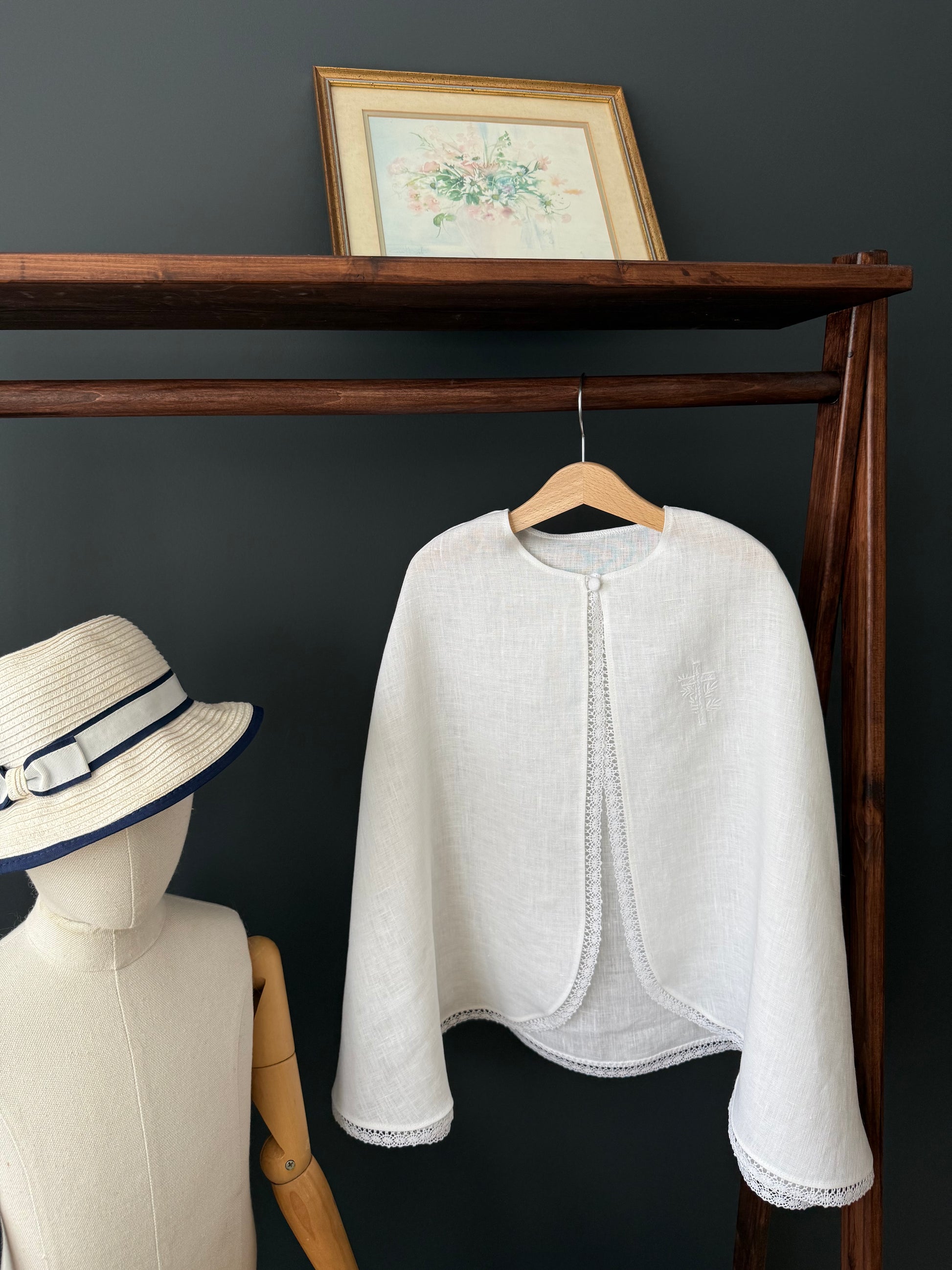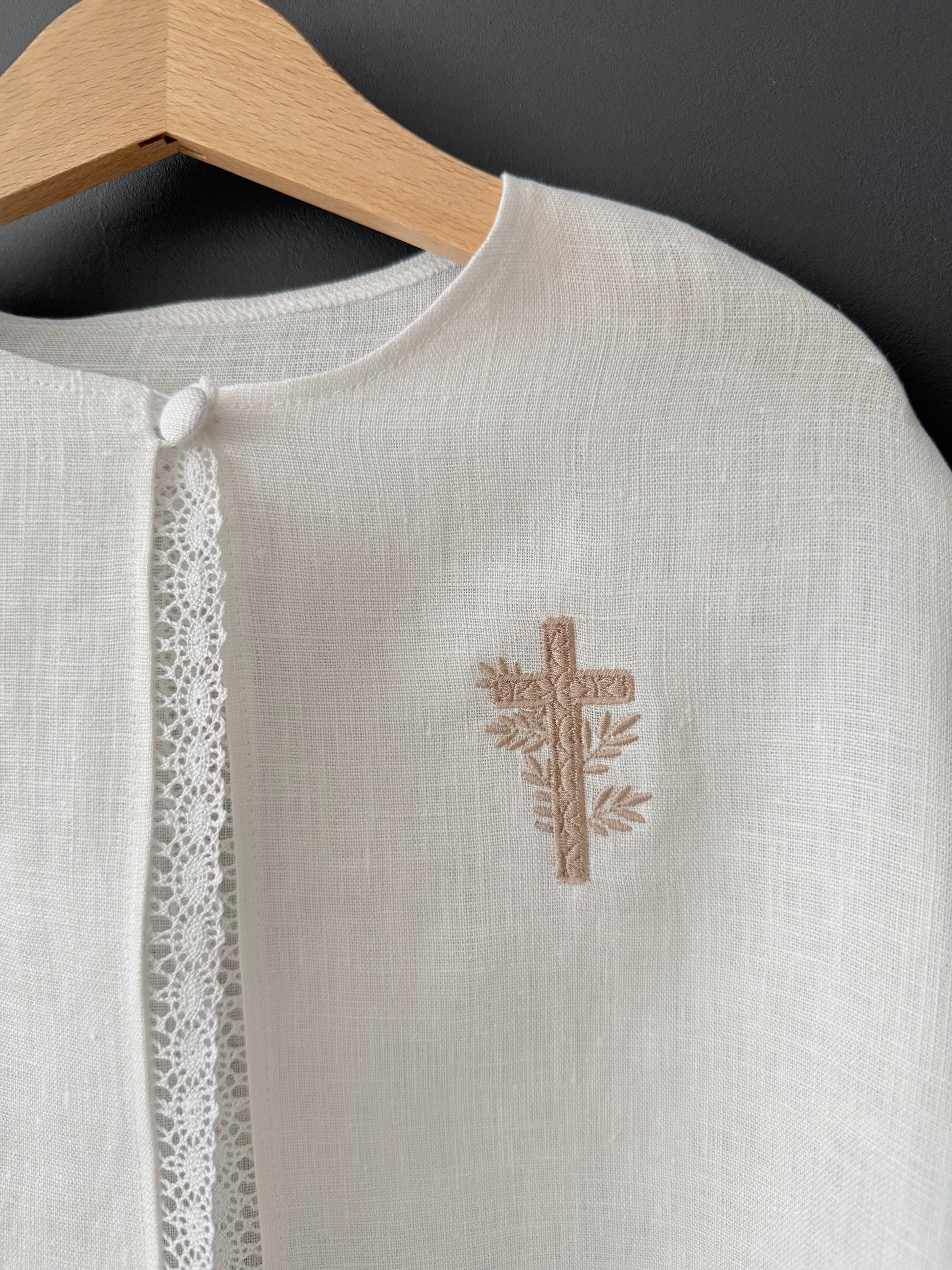 Embroidered white linen baptism or any ceremony gown with embroidery- a meaningful keepsake for your baby’s day. The cape fastens with a button for comfort and safety, while the natural linen brings a timeless and elegant look to the ceremony photos.