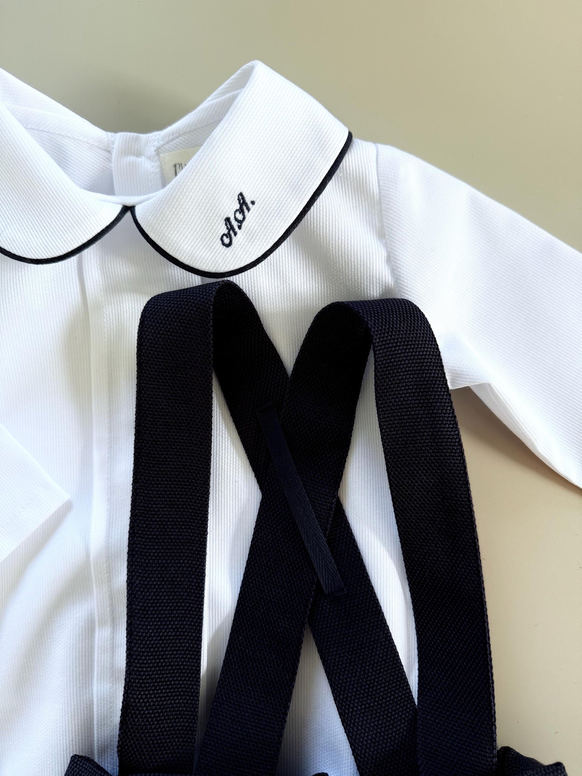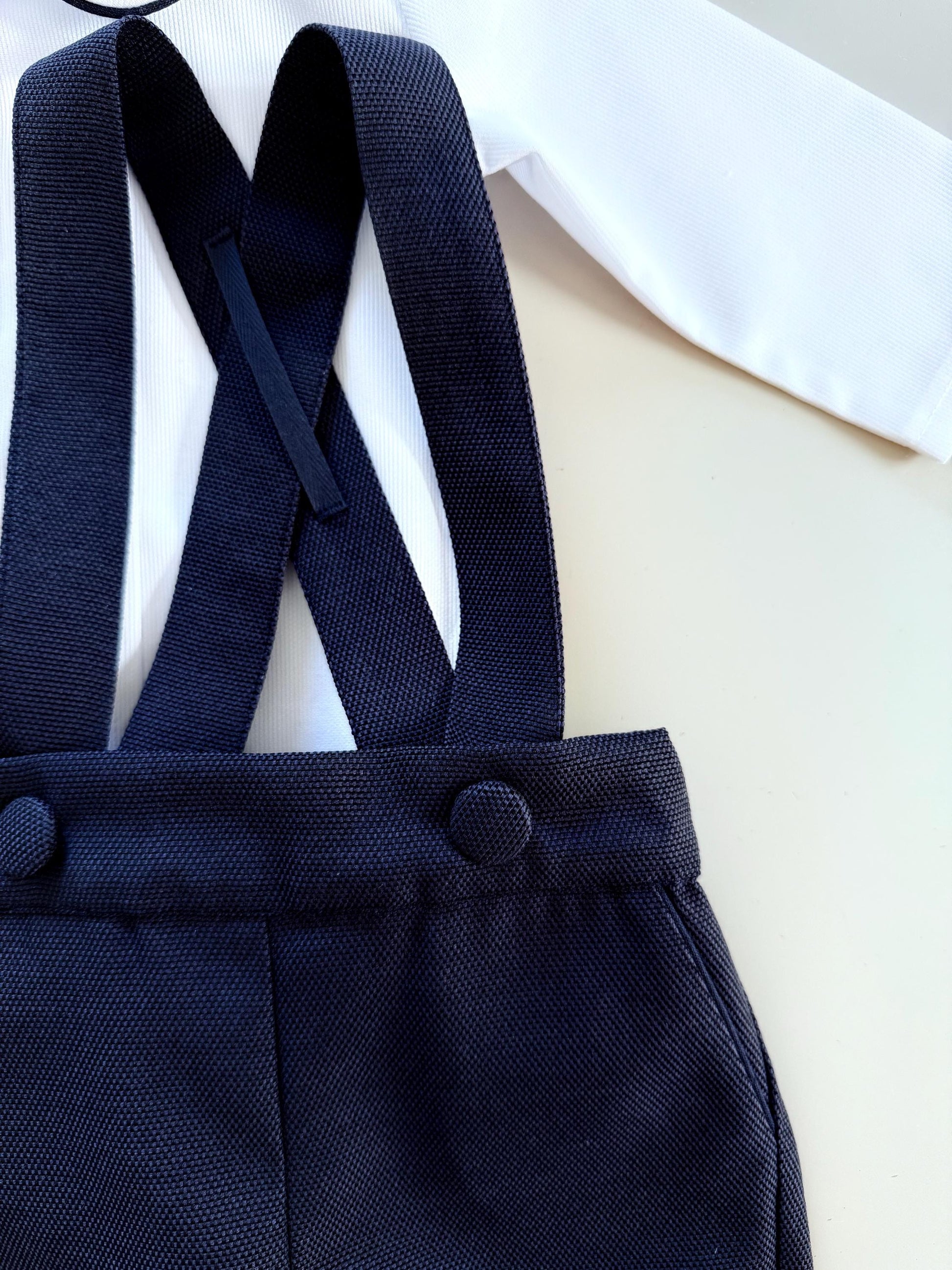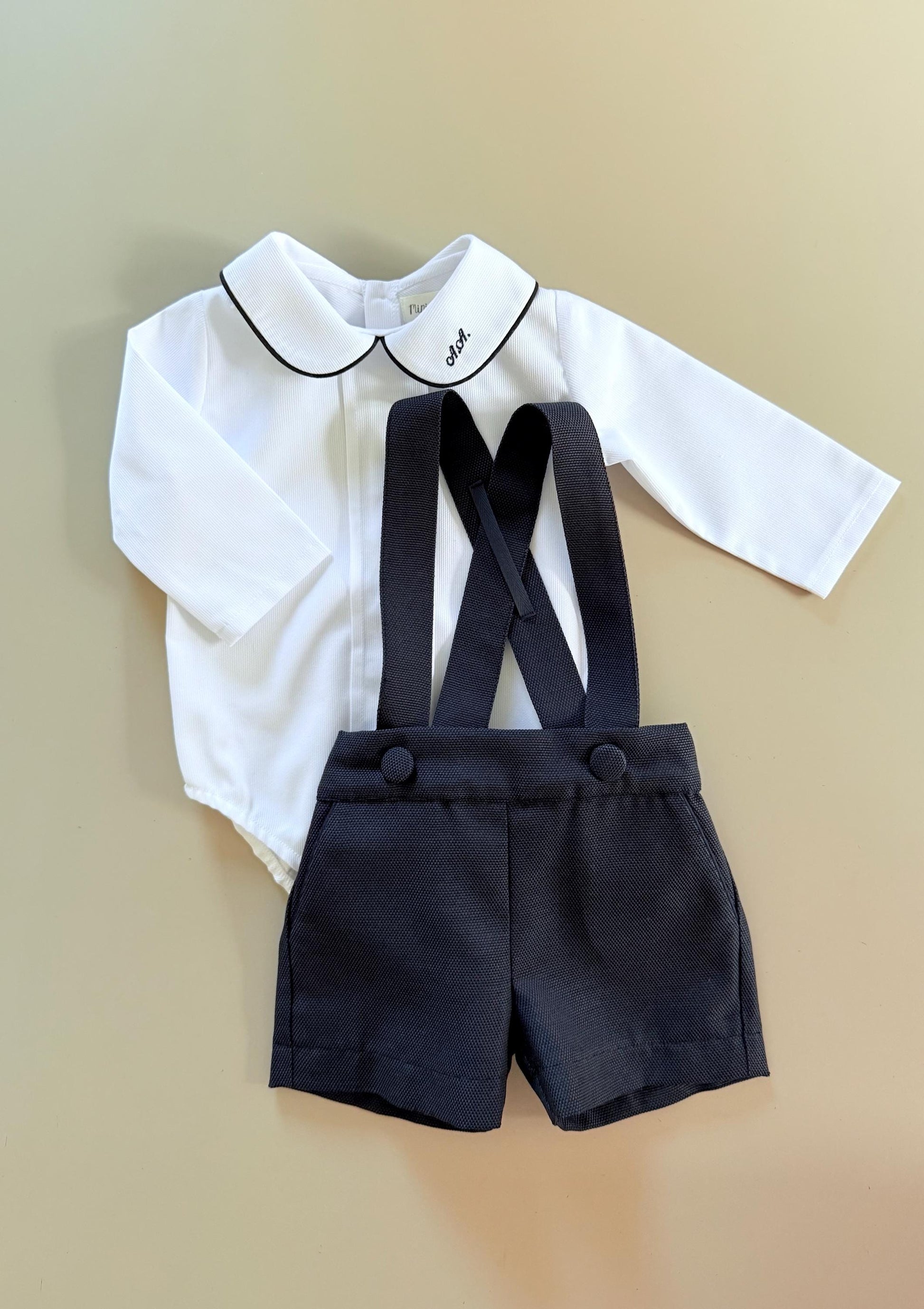 The Niccolo set - personalized white and navy baby boy outfit for a special day. Dress your little gentleman for ceremony, wedding or ring bearer. Crafted with softness in mind, the pure white bodysuit pairs perfectly with the navy shorts, creating an effortless ensemble for your little one. White bodysuit or shirt and navy shorts with piping cord.