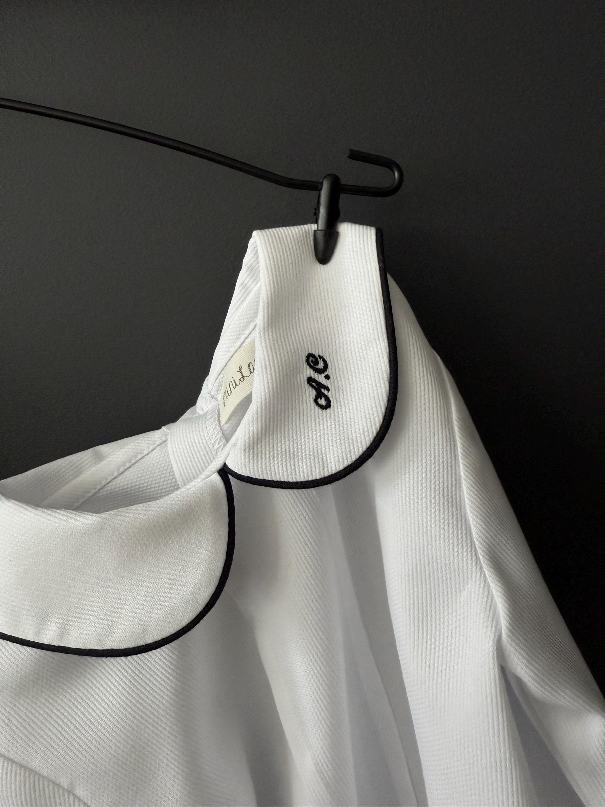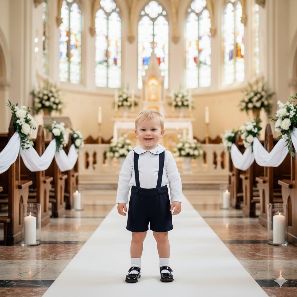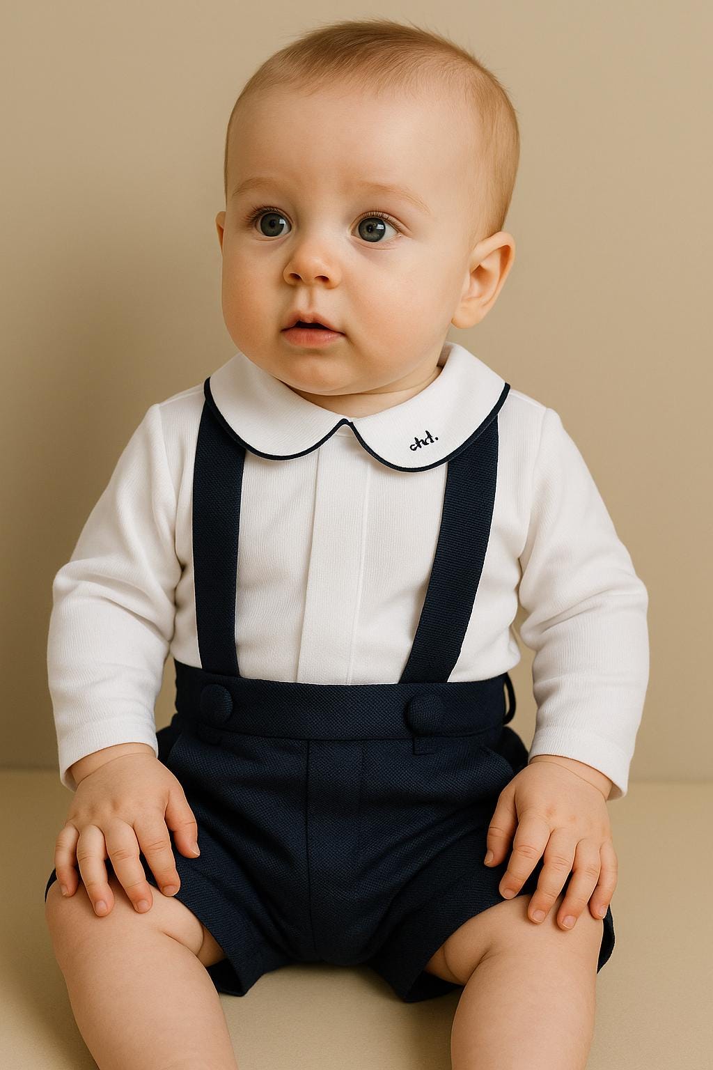 The Niccolo set - personalized white and navy baby boy outfit for a special day. Dress your little gentleman for ceremony, wedding or ring bearer. Crafted with softness in mind, the pure white bodysuit pairs perfectly with the navy shorts, creating an effortless ensemble for your little one. White bodysuit or shirt and navy shorts with piping cord.