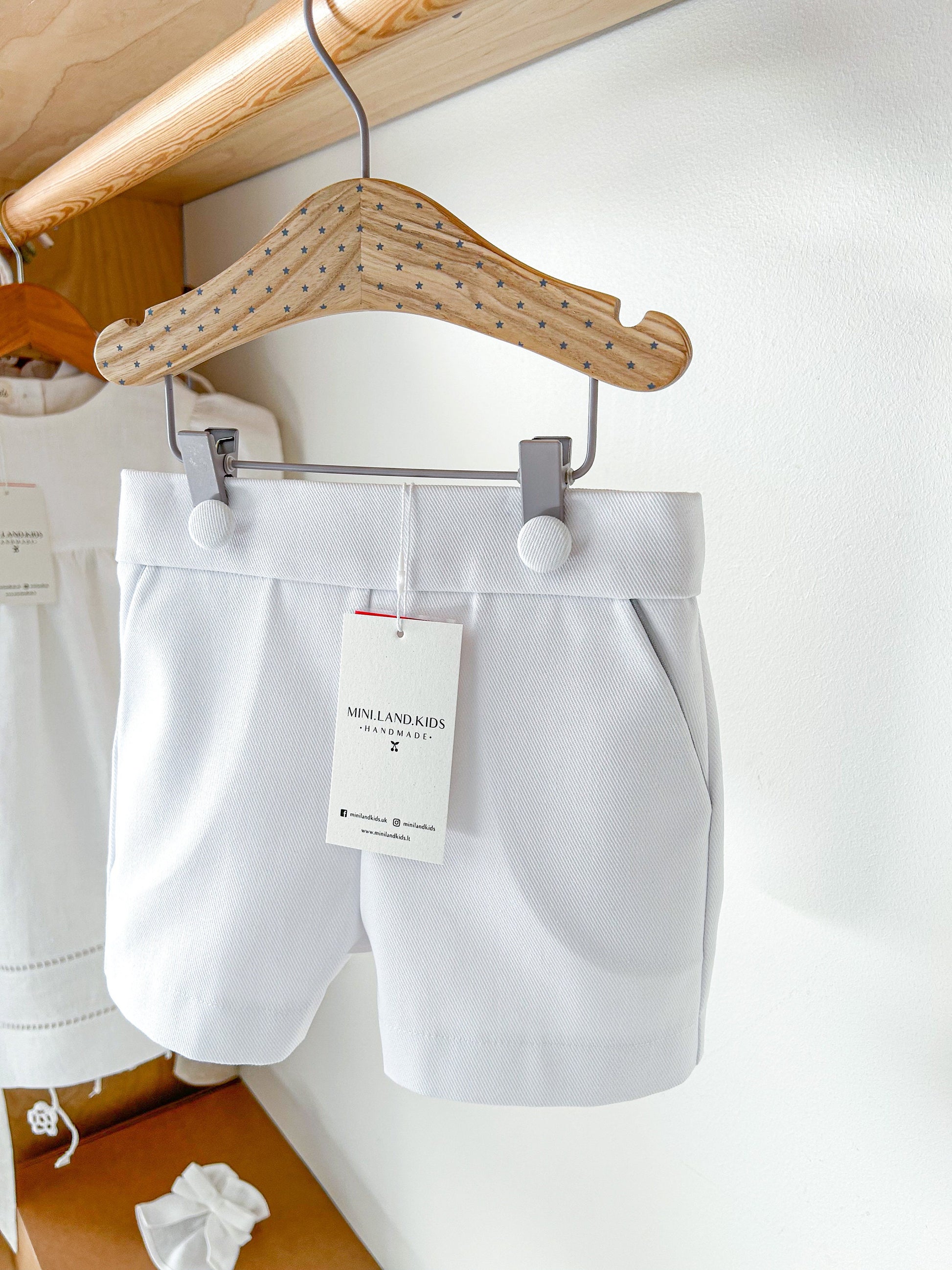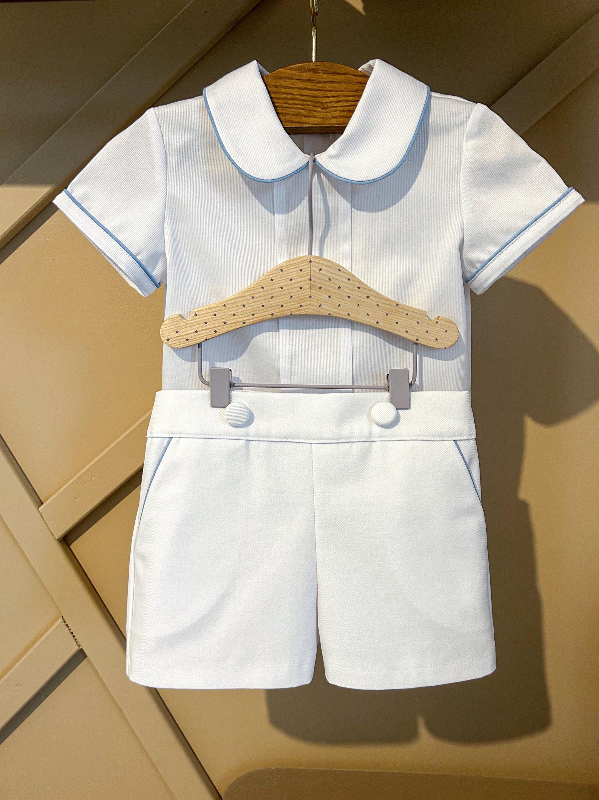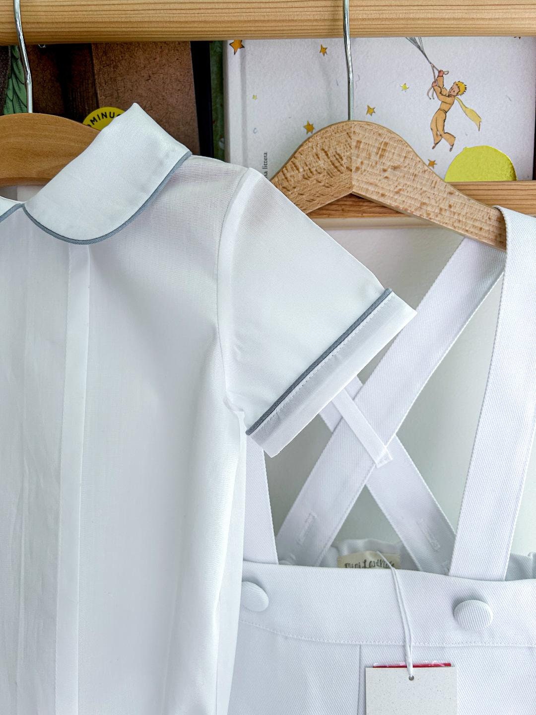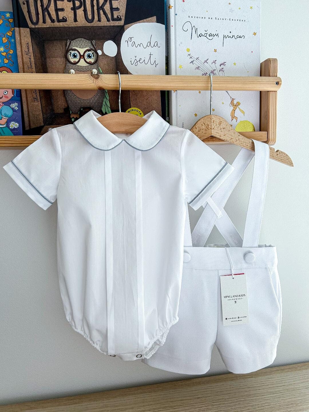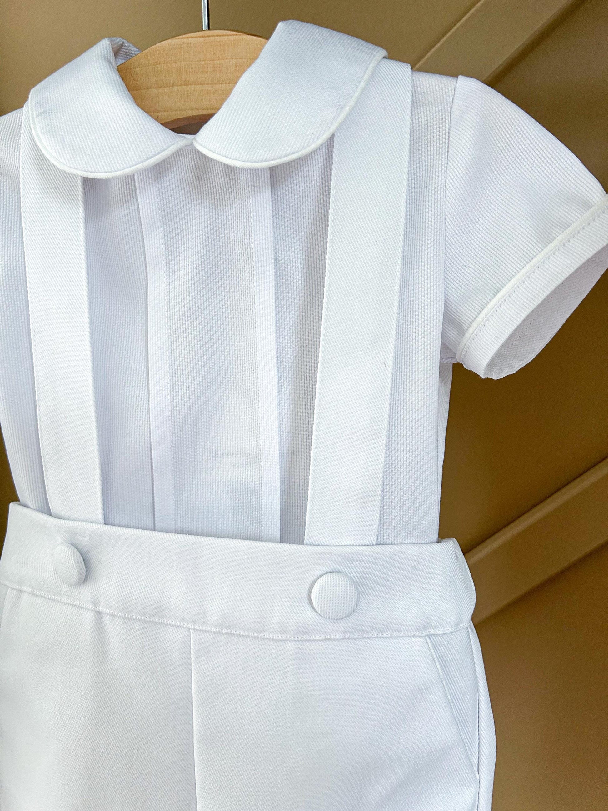 The Massimo set - white baby boy outfit for a special day. Dress your little gentleman for ceremony, wedding or ring bearer. Crafted with softness in mind, the pure white bodysuit or shirt pairs perfectly with the white shorts, creating an effortless ensemble for your little one.