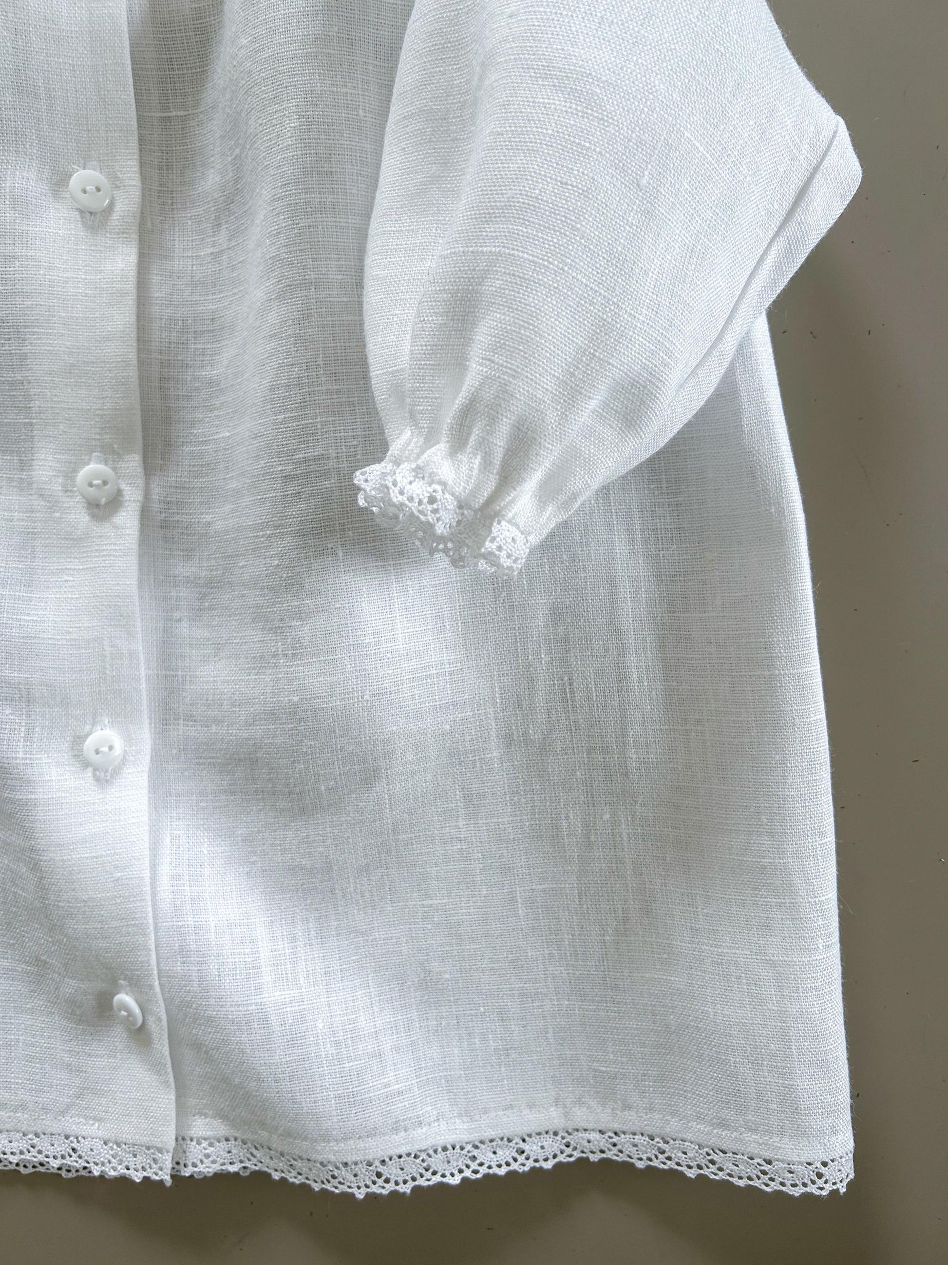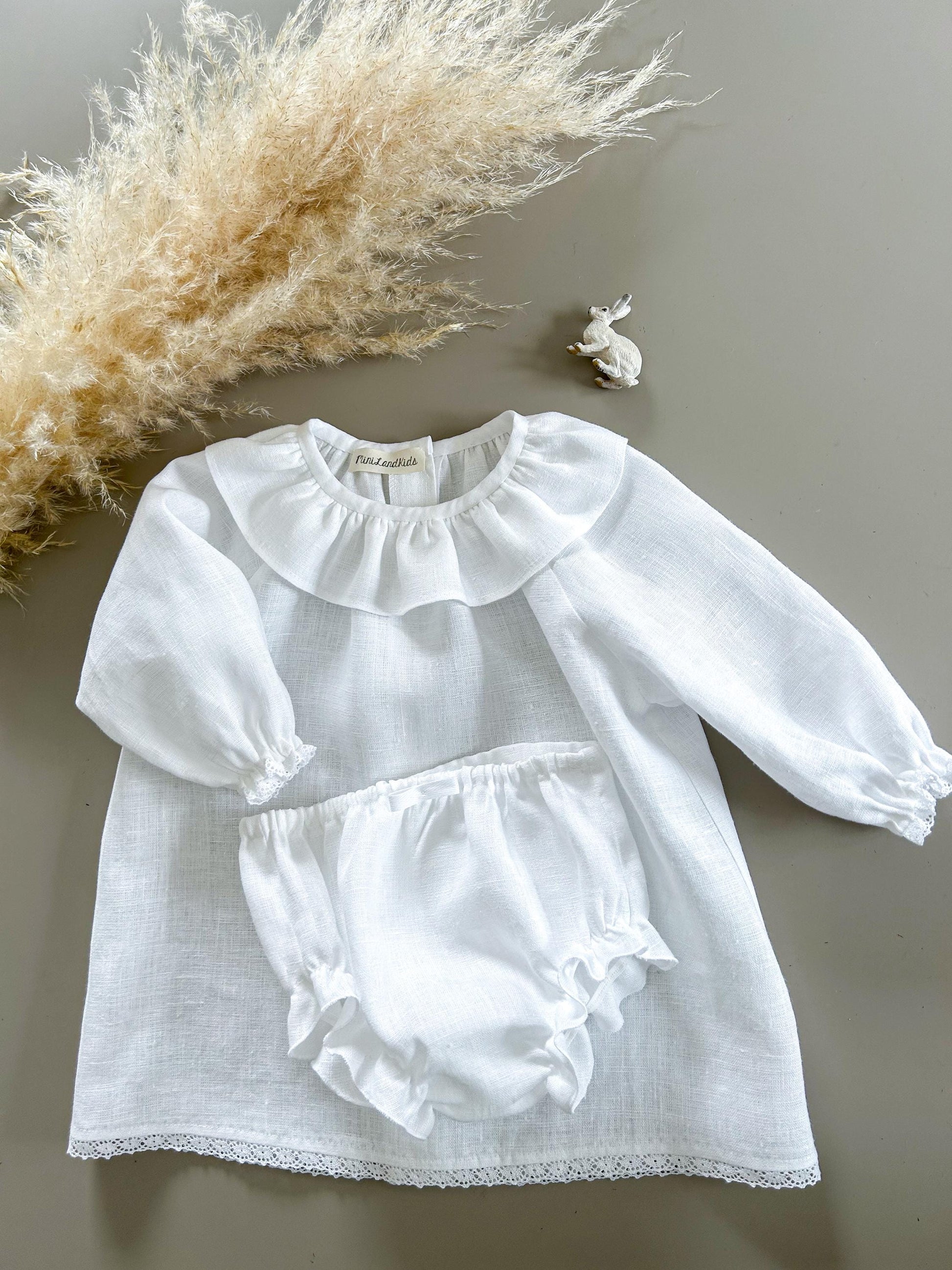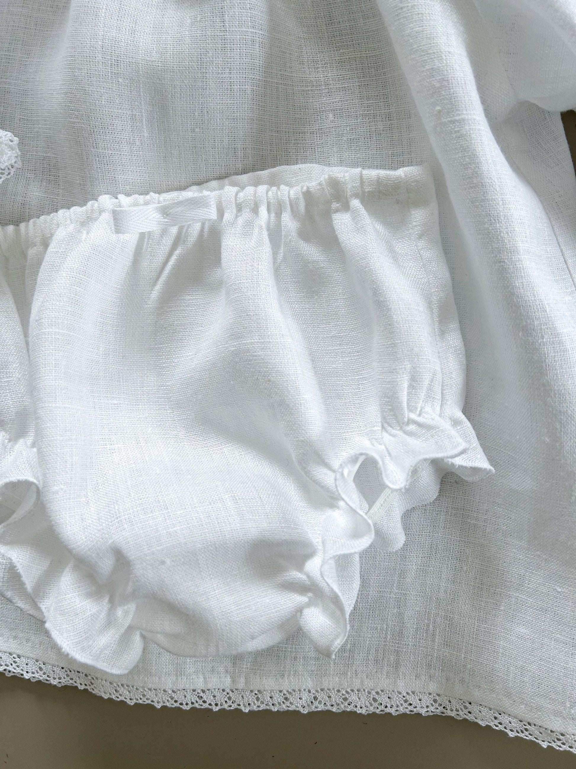 The Bianca dress is crafted from soft linen, creating a soft, heirloom-inspired look. A classic rounded collar, fine lace details, and gentle gathers at the collar give it an elegant, timeless silhouette. With bloomers.
