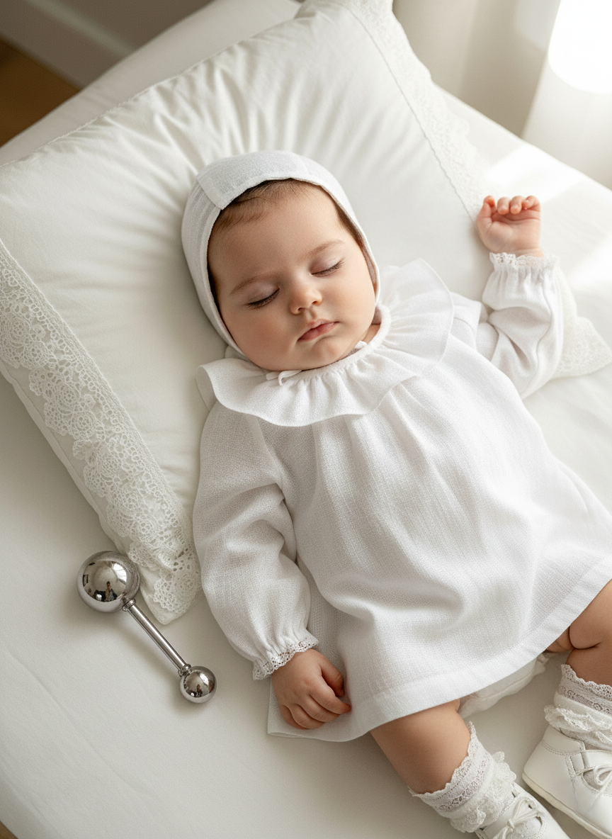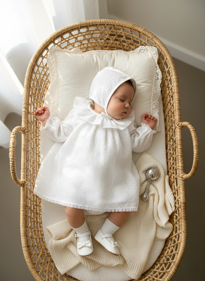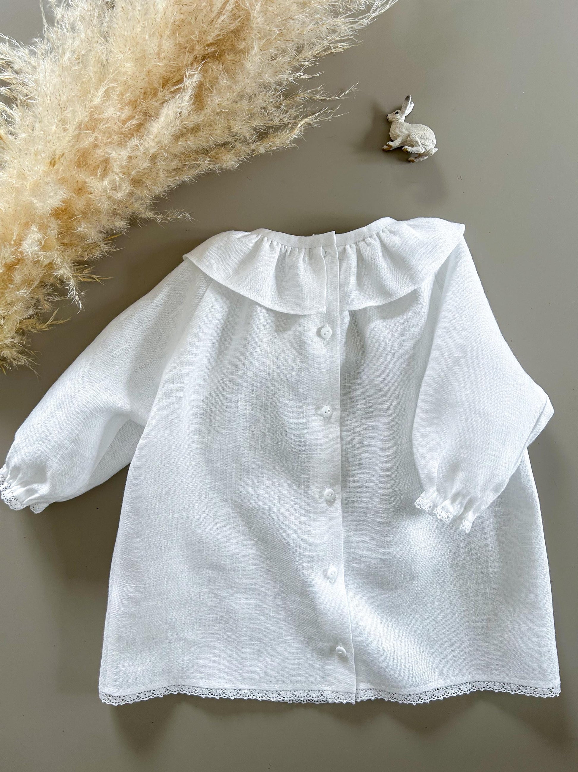 The Bianca dress is crafted from soft linen, creating a soft, heirloom-inspired look. A classic rounded collar, fine lace details, and gentle gathers at the collar give it an elegant, timeless silhouette. With bloomers.