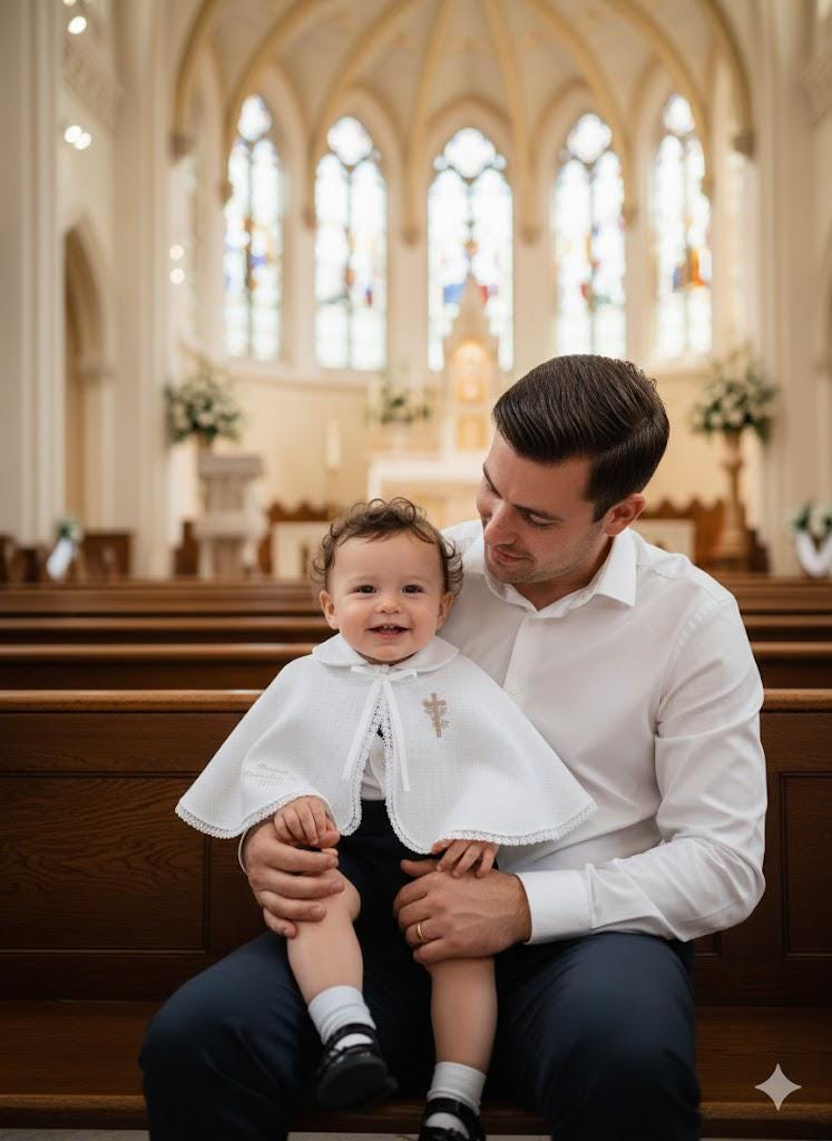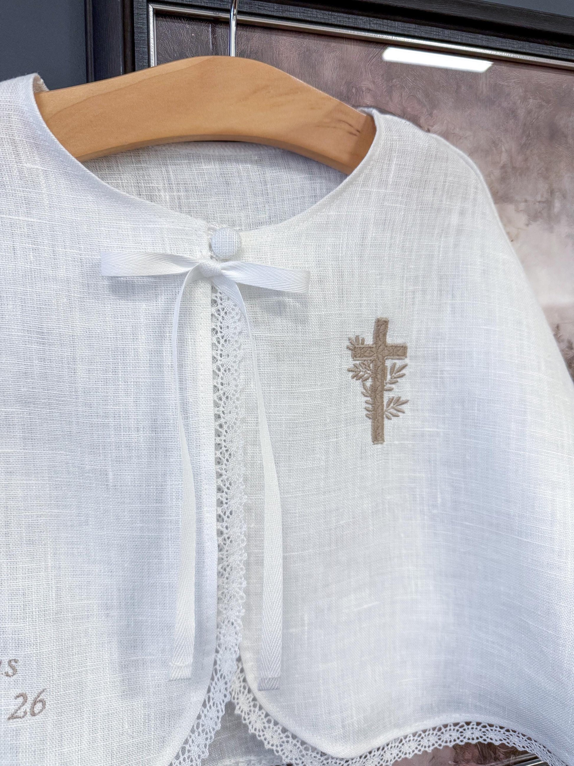 This linen baptism cape is crafted from high-quality natural white linen and delicate lace, offering a soft and timeless look. Designed with refined details, it is a meaningful piece to be cherished long after the ceremony.