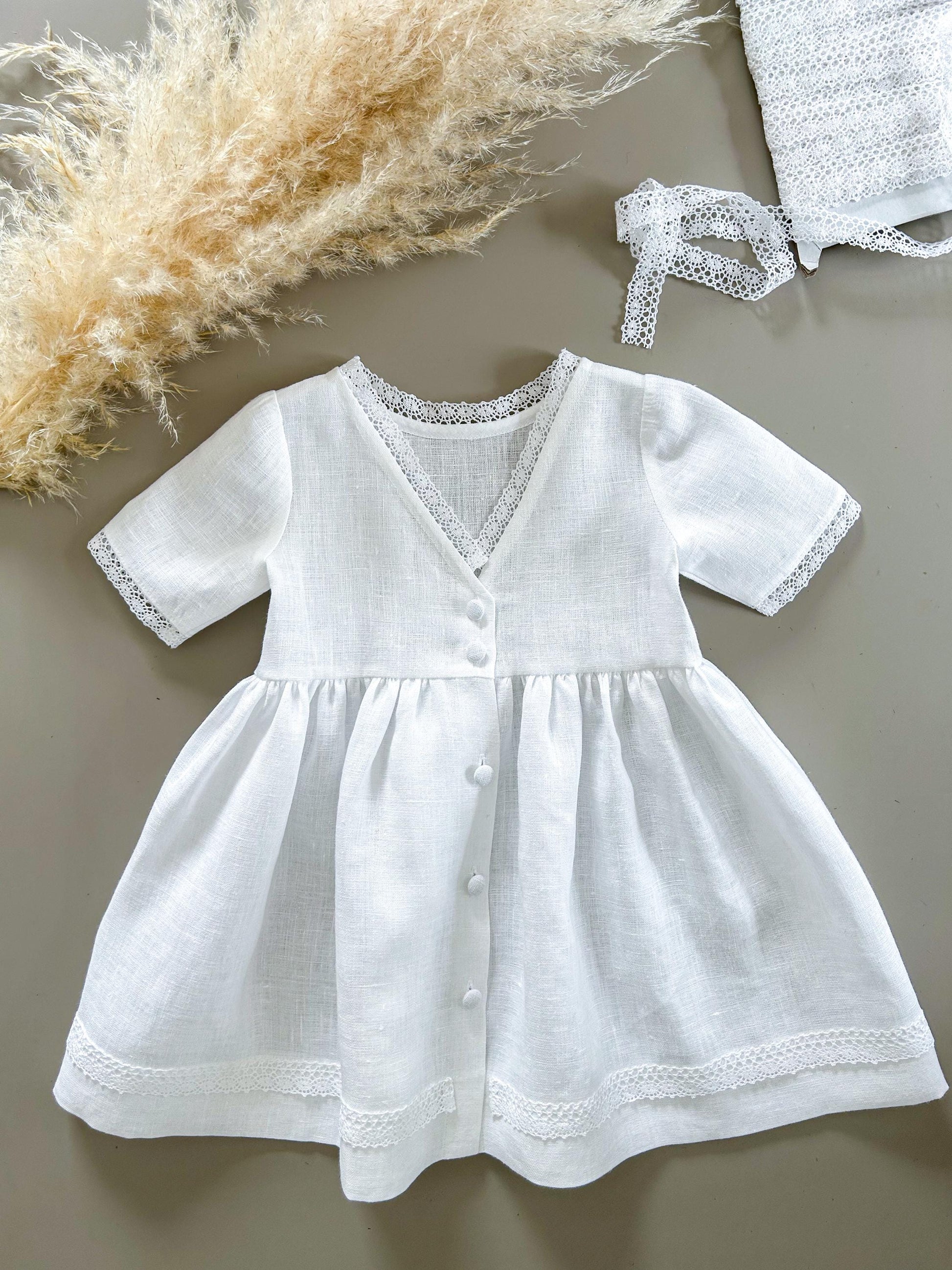 The Matilde dress is crafted from soft white linen, creating a soft, heirloom-inspired look. A classic rounded collar, fine lace details, and gentle gathers at the waist give it an elegant, timeless silhouette.